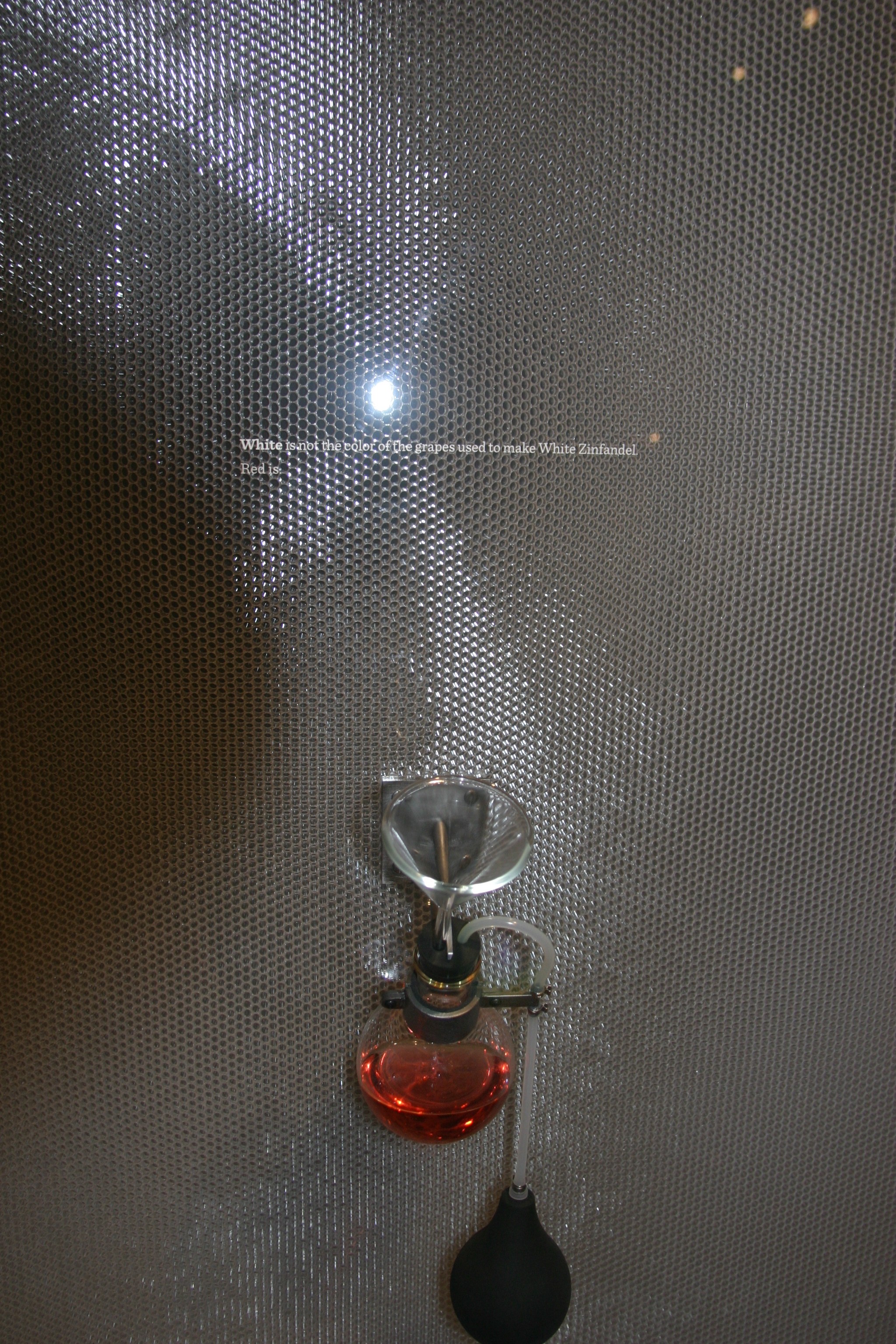 The first scent installation is a series of modern glass beakers mounted on an opaque glass wall, full of various types of wine with aeration bulbs that enhance smelling of each wine. Above each vessel are descriptions of the wine organized by quite imaginative aromatic labels. Each aromatic descriptor is accompanied by an explanation of its historical origin and marketing value. My personal favorite of the series is “Hamster Cage.” From the other side of the wall, the installation takes on a more voyeuristic and visual dimension as one sees the shadows of visitors tentatively stooping down to peer at or inhale something from obscure vessels.
