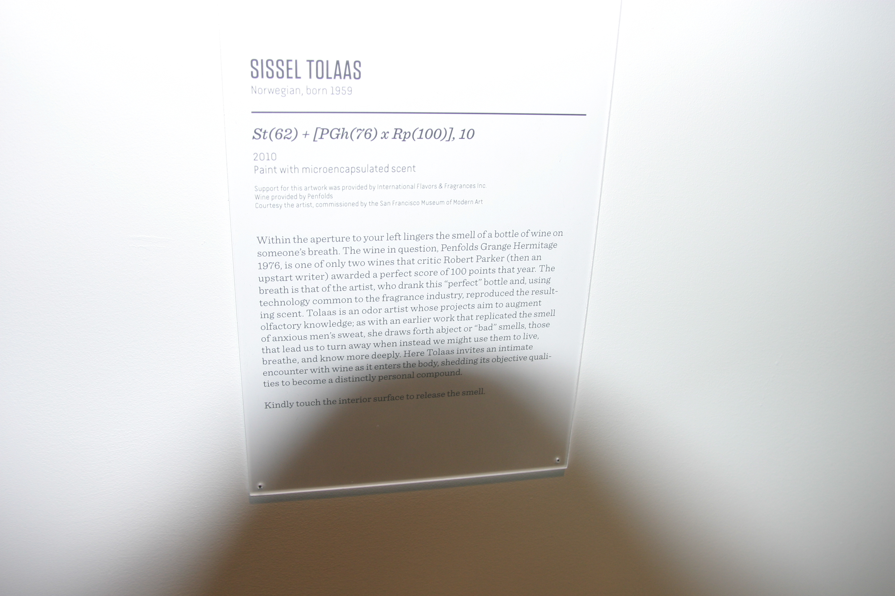 Sissel Tolaas‘ piece is easy to miss but for the small plaque indicating her reproduction of the scent of a 1976 wine that earned a rare 100 points from a young Robert Parker. Tolaas drank the wine and analyzed the chemical composition of its odor on her breath using headspace technology. She then recreated the odor compound and put it into a container of white paint. This paint was finally applied to a small alcove in the corner of one of the galleries.